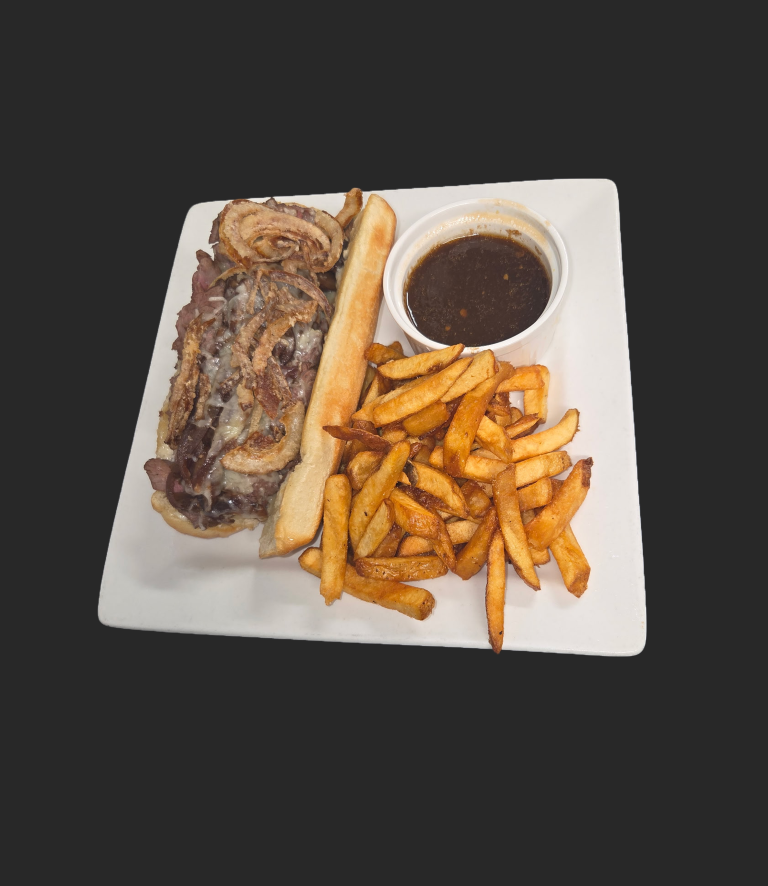 Shaved beef tenderloin with mushroom and onions. Served on a rustic hoagie bun with au jus and French onions. Served with your choice of side