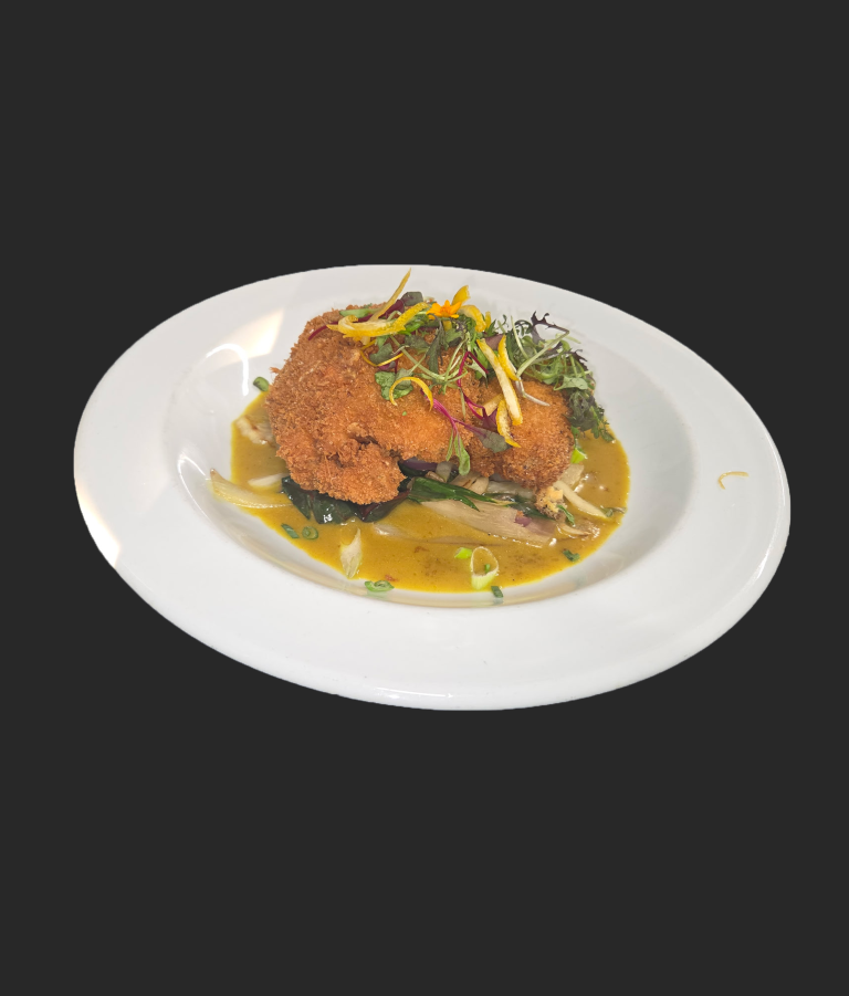 Panko crusted crispy salmon & shrimp cakes with pepper, onions & fresh herbs. Served on sauteed fennel, green apple and Swiss chard greens with a coconut curry broth